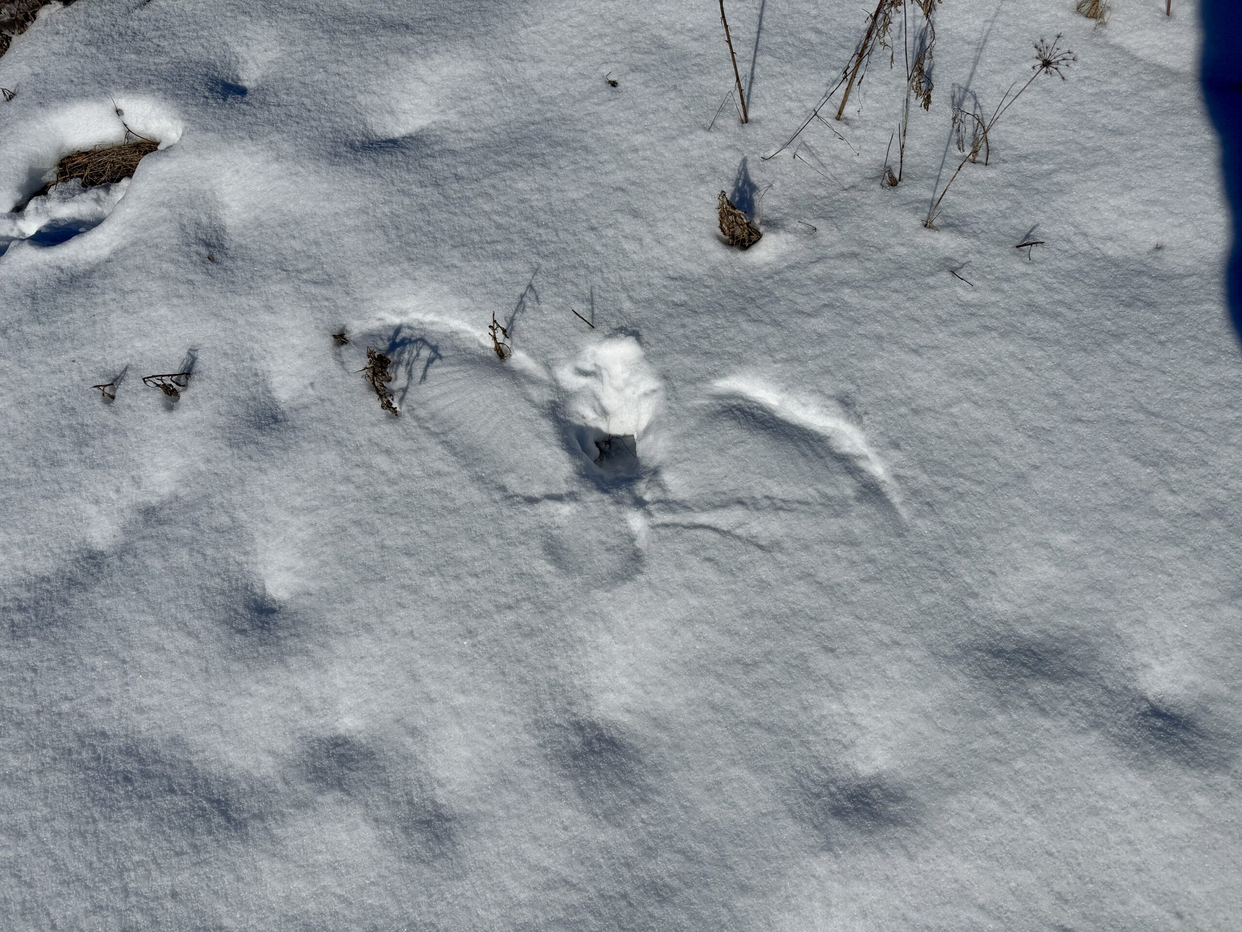 This wing imprint in the snow is evidence of a raptor—likely an owl or hawk—successfully hunting. Birds of prey use their keen eyesight and hearing to detect small mammals, even beneath deep snow. This is a great example of how birds have evolved to hunt efficiently, even in harsh winter conditions. — at Dow Wetlands.