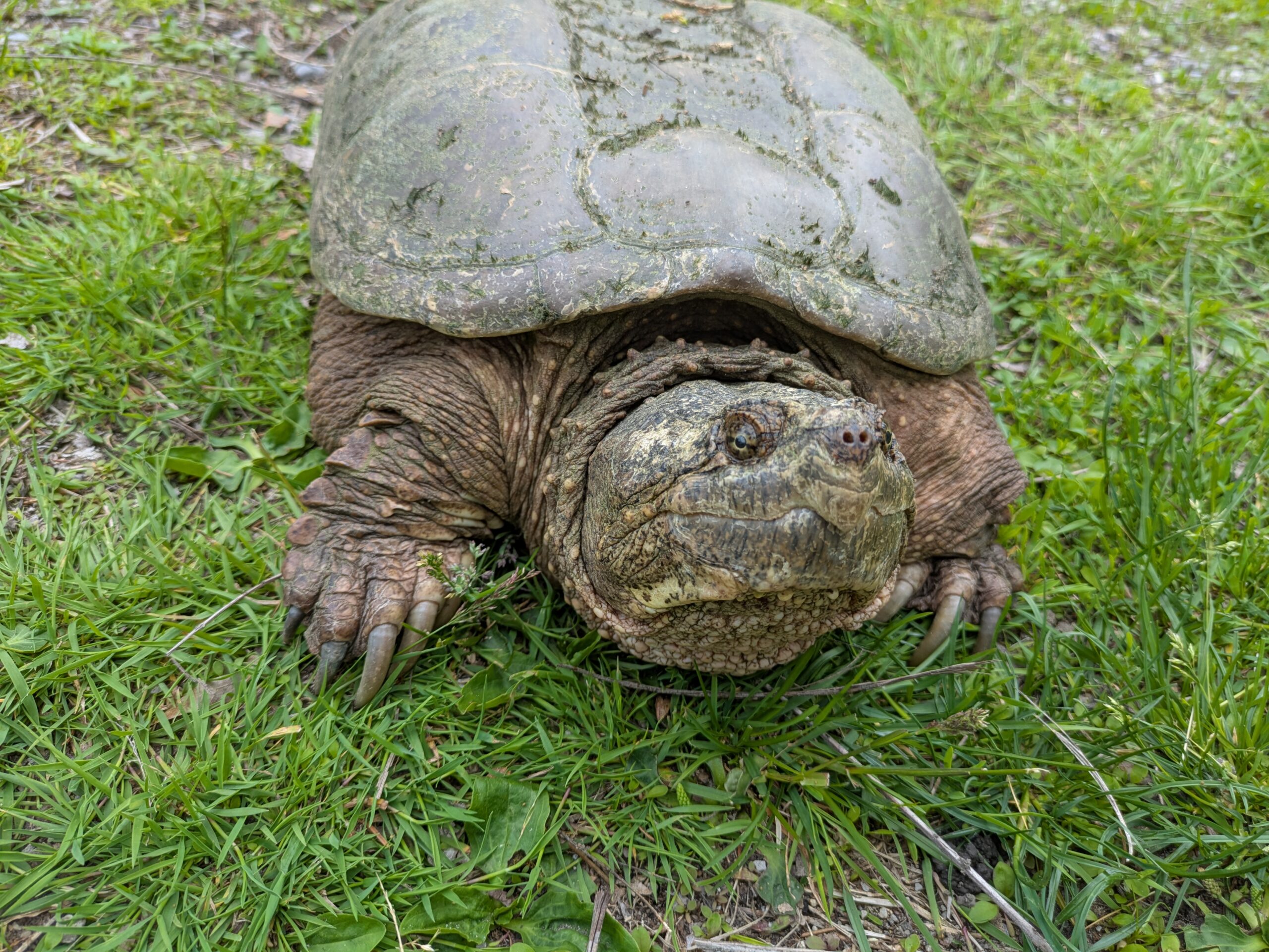 It’s turtle egg-laying season. Turtles seem to put themselves in danger crossing roads to get to the ideal location. This monster was almost hit numerous times near Lake Chipican.