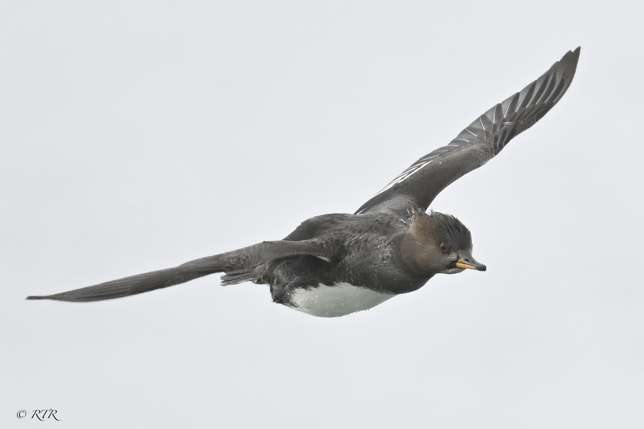 Female Hooded Merganser flying