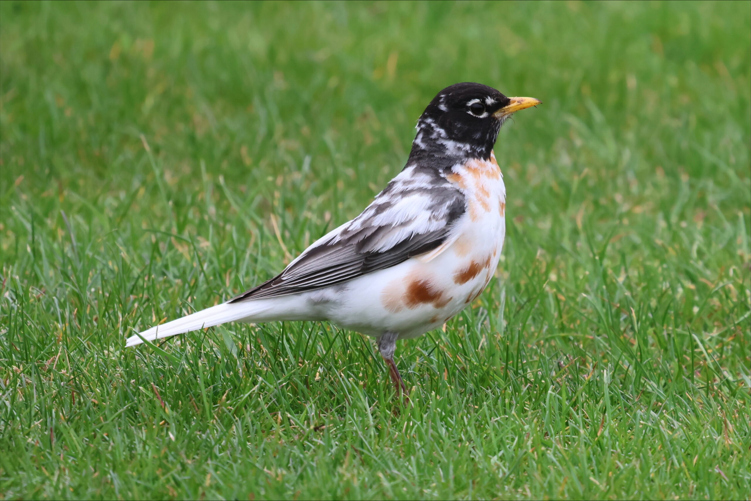 This Robin has a condition called Leucism (reduced pigmentation that causes their feathers to be white) spotted at St Clair Parkway Golf Club