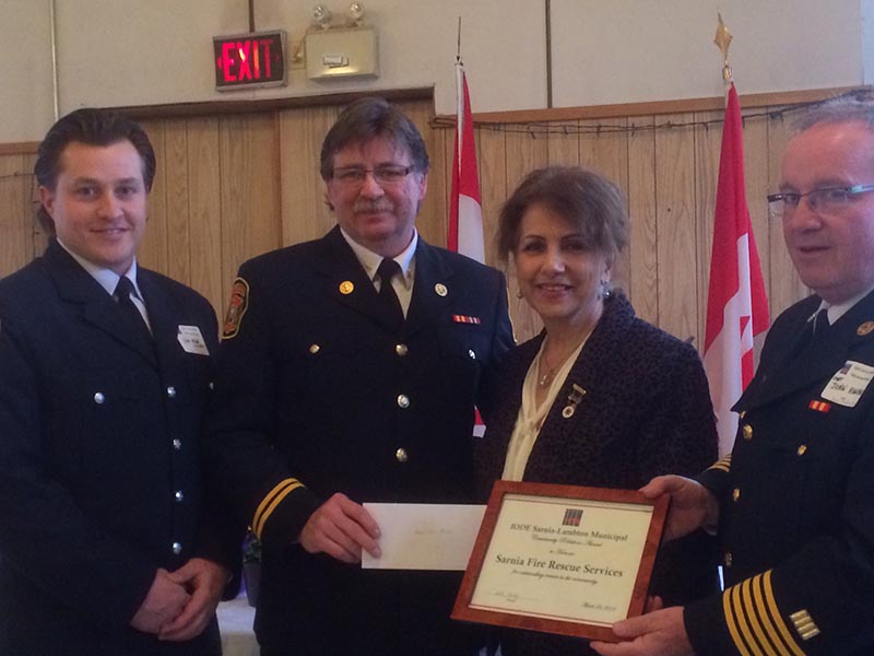 The IODE has presented Sarnia Fire Rescue Services with its Community Relations Award. Presenting the award here is IODE Sarnia-Lambton municipal chapter citizenship officer Leila Boushy, with, from left, firefighter…