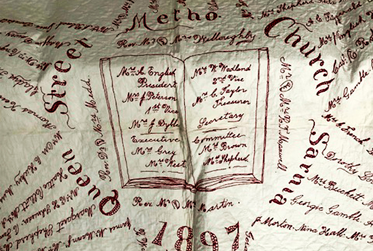 One thin dime. That’s what the ladies of Queen Street Methodist Church charged local residents to have their names embroidered on the queen-sized quilt in 1897.