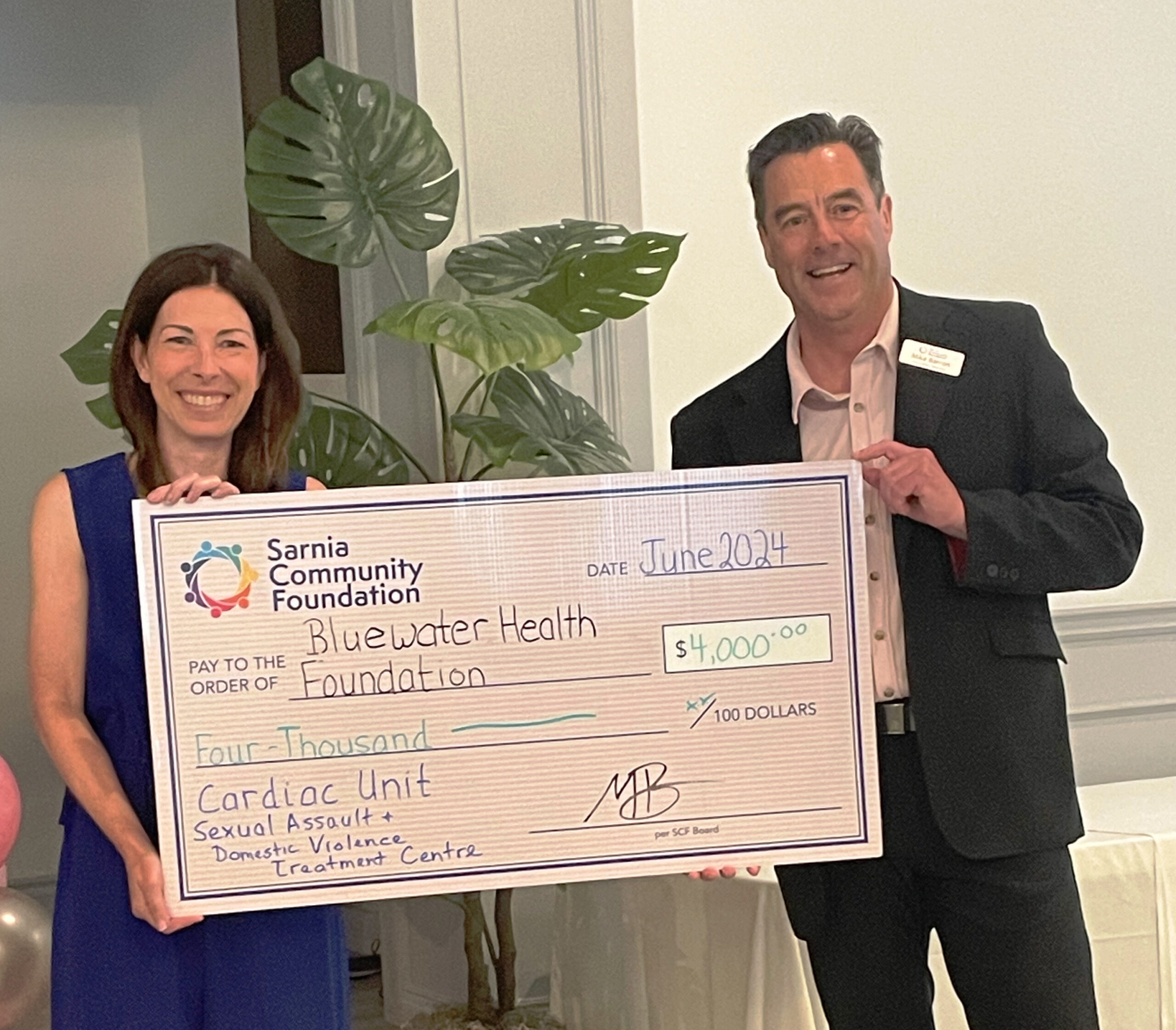 Mike Barron, executive director of the Sarnia Community Foundation presented Kathy Alexander, executive director of the Bluewater Health Foundation, with donations of $2,000 for cardiac care at the hospital and $2,000 for…