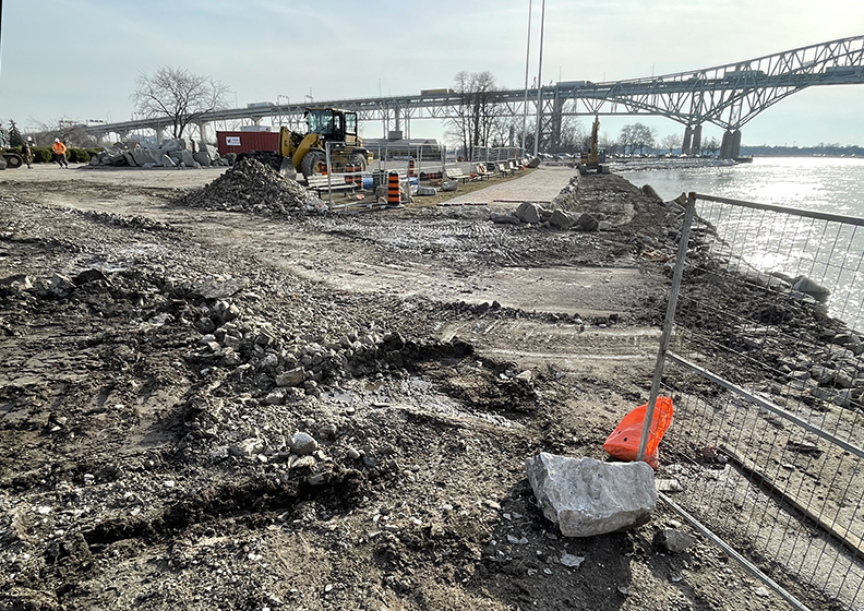 Cathy Dobson Fencing is up and pedestrian access is shut down along a portion of Point Edward’s waterfront just north of the Bluewater bridge to accommodate shoreline protection work.