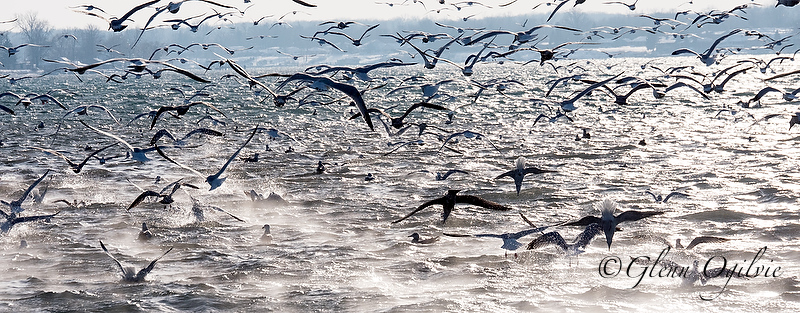A huge flock of gulls and terns feed on a school of small fish near the outflow of Talfourd Creek into the St. Clair River, near the Shell Canada refinery…
