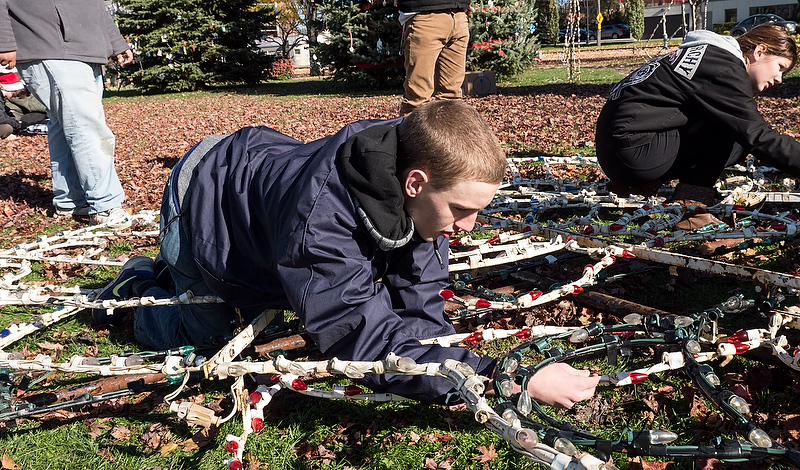 Brett McCallum, left, and Amber Druer replace old bulbs as part of an energetic group of 60 Alexander Mackenzie Secondary students who converged on Centennial Park last week to help…