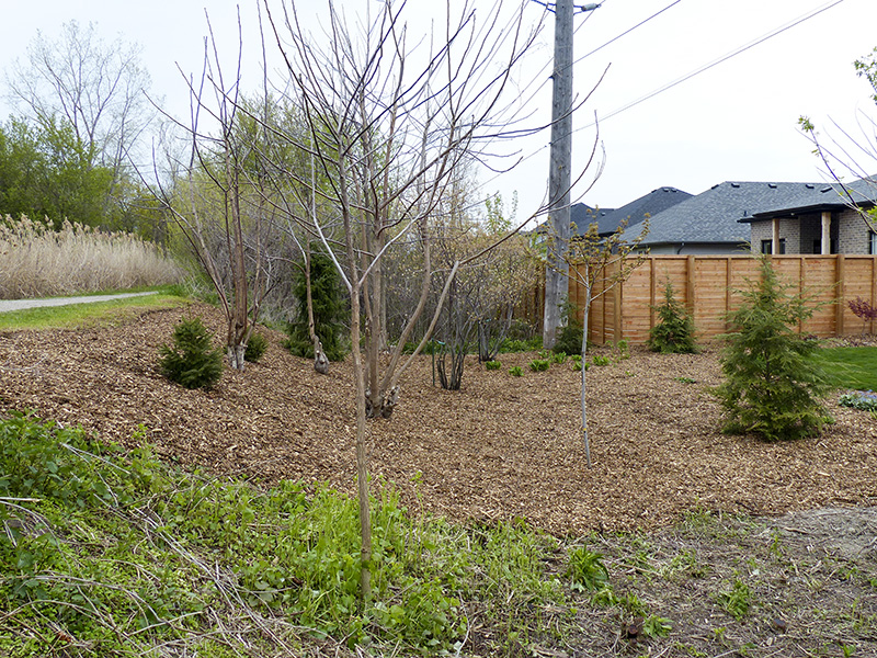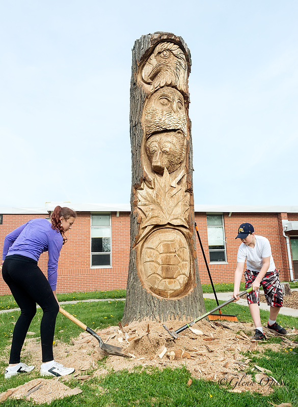 Launa Romoewski and Holden Robertson clean up the debris after chainsaw artist Mike Winia turned this major tree stump into a work of art on the front lawn of Lansdowne…
