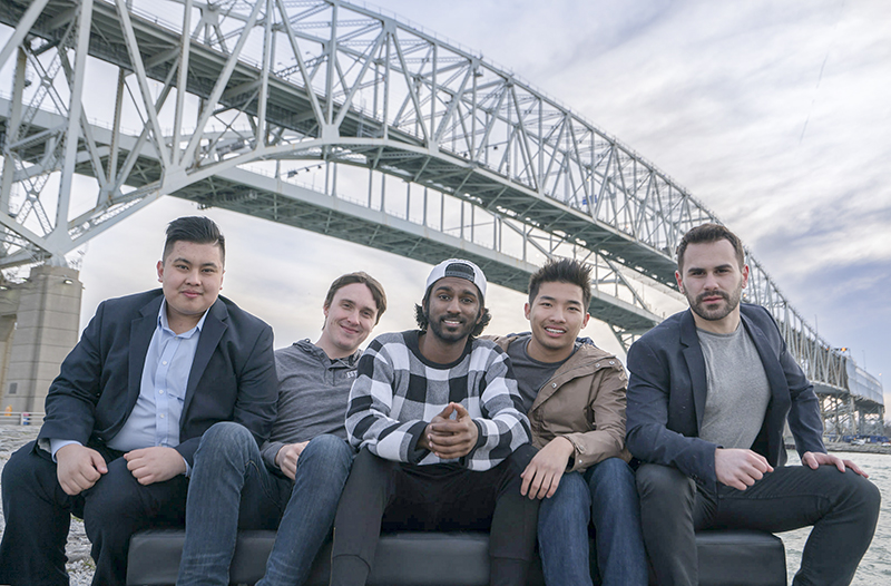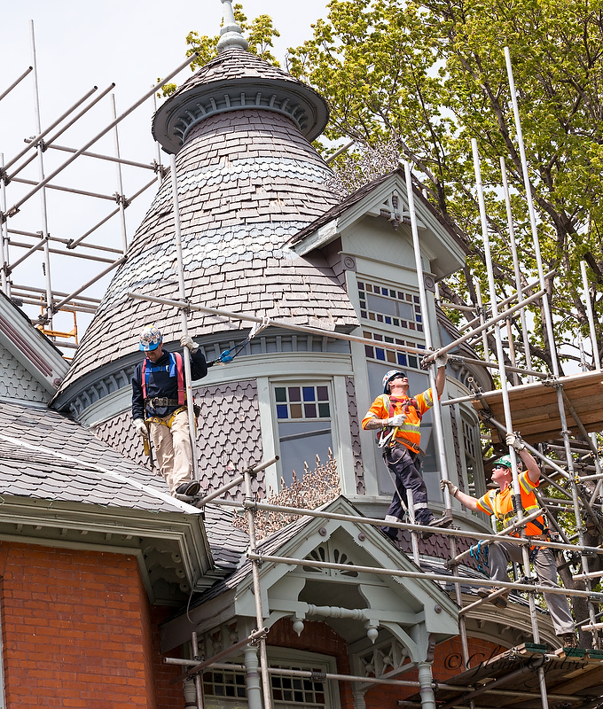 Carpenters, from left, Colin Shand, Jarrett Bell and Jamie Smeets of Steeplejack Services erect scaffolding at Sarnia's iconic Lawrence House, which is undergoing numerous repairs.