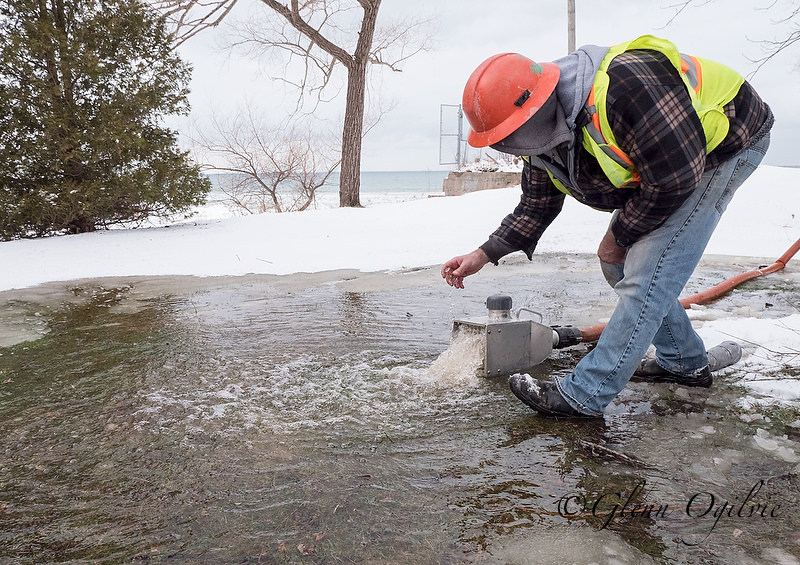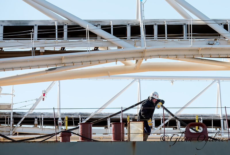An unidentified worker drags a sandblasting hose across the deck of the SS Calumet, a Great Lakes bulk carrier berthed at the North Slip in Sarnia Harbour.