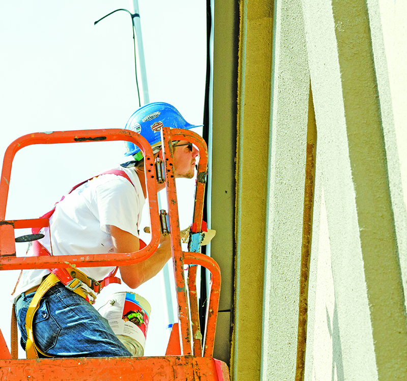 Cory Sowinski, a painter with Four Star Painting of Sarnia, checks for missed spots while sprucing up the Henry Ross Substation on Front Street. The stucco exterior is being repaired…