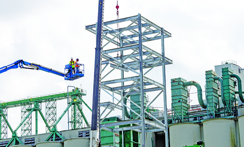Workers move into position at a contruction project at the Cargill Limited grain elevators on Sarnia Harbour The $3-million upgrade will improve the receiving system for incoming grain and result…