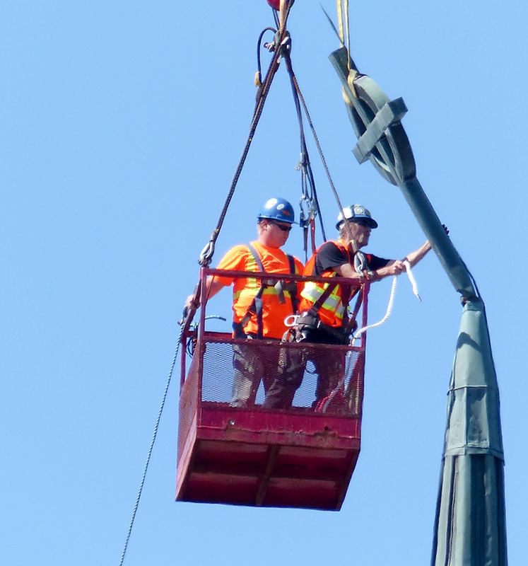 Workers from Imperial Roofing secure the damaged cross atop St. Andrew's Presbyterian Church, moments before Mammoet Crane lifted it to the ground beside Christina Street today.