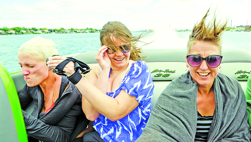 It was not a good hair day for media types participating in a June 23 promotional event for the International Powerboat Festival. From left, Heather Manners of K106 FM Radio,…