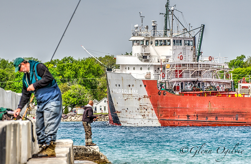 Anglers have had success lately catching trout from boats and the shore near the mouth of Lake Huron. Here, a pair of fisherman do their thing while the downbound bulk…