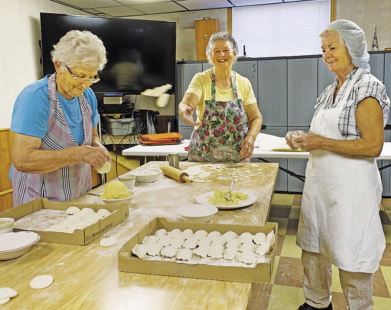 Hedy Krasinkiewicz, centre, fires circles of dough through the air to a waiting team of perogie-makers at Queen of Peace Church, with Kay Robor, left, and Isabella Czainski looking on.…