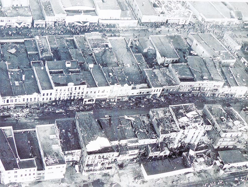 THEN ... Hundreds of milling residents can be seen surveying the wreckage in this aerial photo, taken May 21, 1953, just hours after a powerful tornado ripped through Sarnia’s downtown.