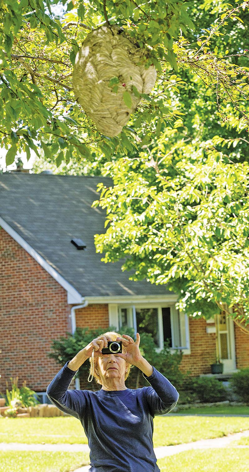 Nancy Stock takes a snapshot of a large hornet nest in front of her home on Coral Way. The tree was buzzing with bald-faced hornets, a specie known for their…