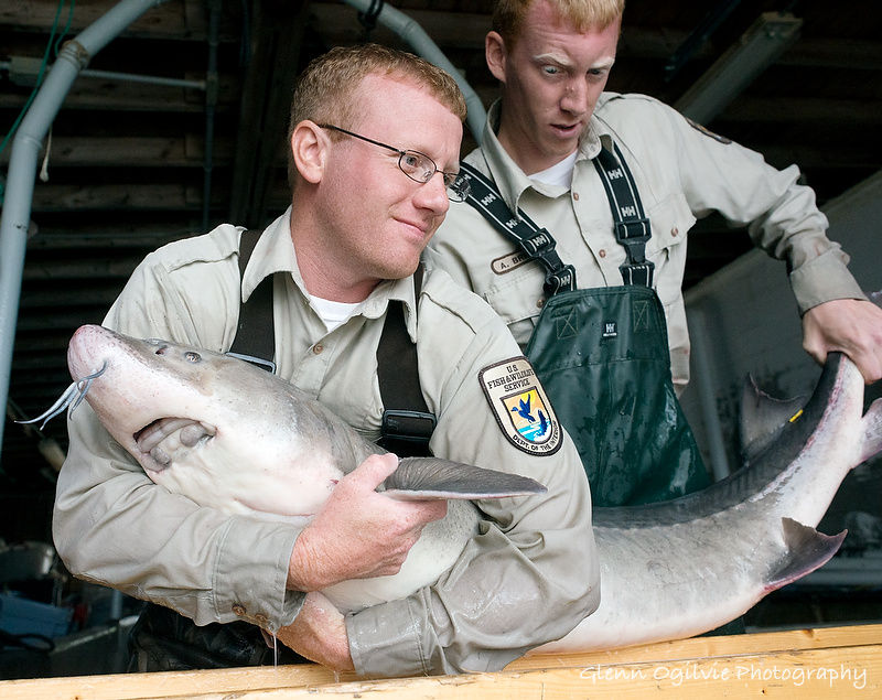 U.S. Fish and Wildlife Service biologists Justin Chiotti and Andrew Briggs, wrestle one of 14 sturgeon being tagging at Purdy Fisheries as part of an international restoration effort.