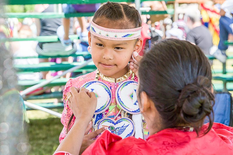 Addyson White, 7, receives help from her mom Shannon White while preparing for a traditional dance at the Aamjiwnaang First Nation's Powwow on Saturday, June 21.