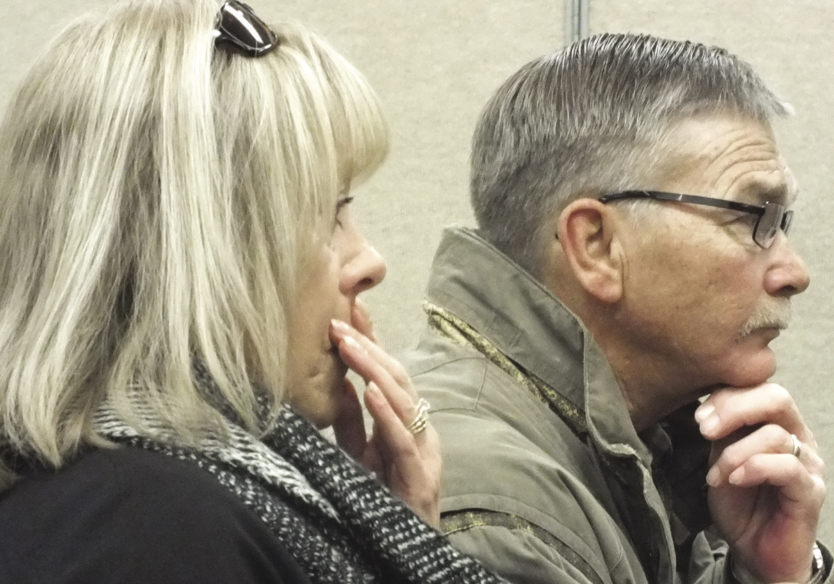 The sister of Karen Caughlin, Marylou Schwemler, seen here with her husband, holds in her emotions as the OPP screen a new video that investigators hope will jog memories about…