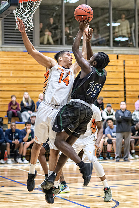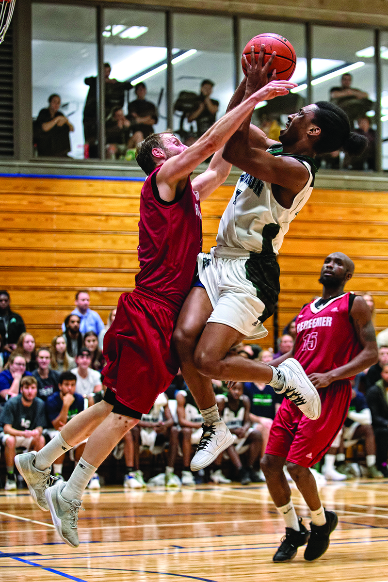 Journee Joseph of the Lambton College Lions men's basketball team is fouled by Redeemer Royals guard, Zack Angus, during the Lions' first home game of 2018. The Lions slipped behind…