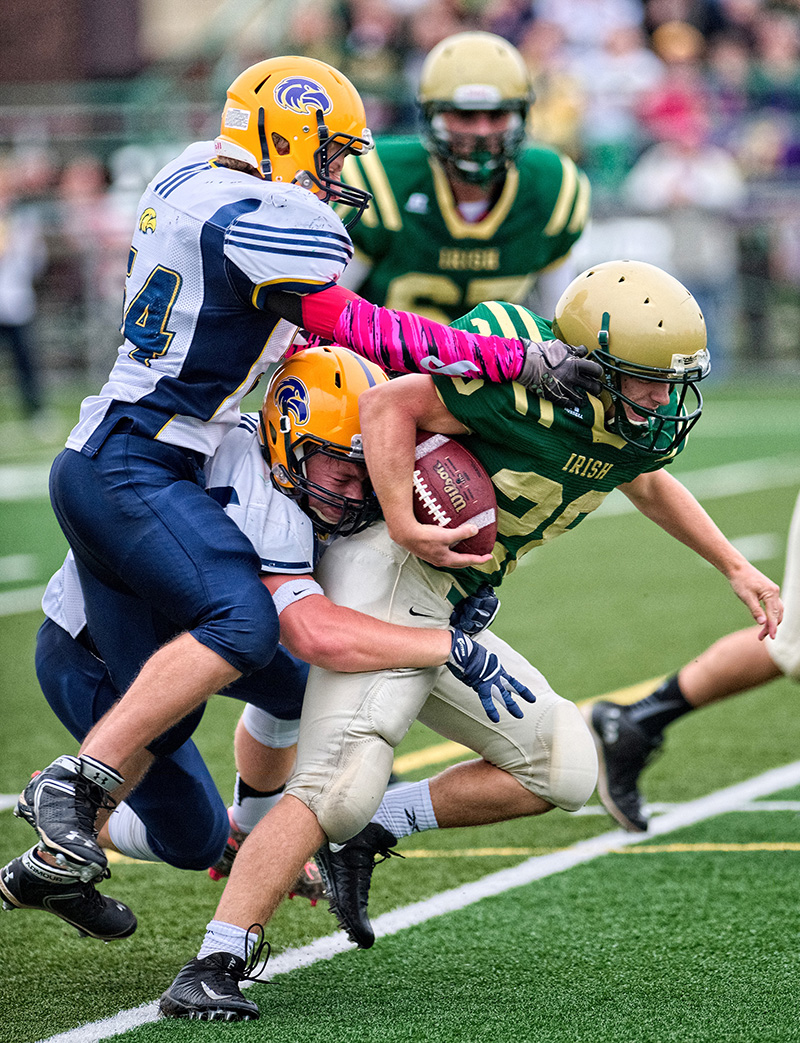 The St. Patrick’s senior football team was rock solid in the school’s homecoming game played Oct. 6 at Norm Perry Park. Here, it takes two Chatham Kent Hawks to take…