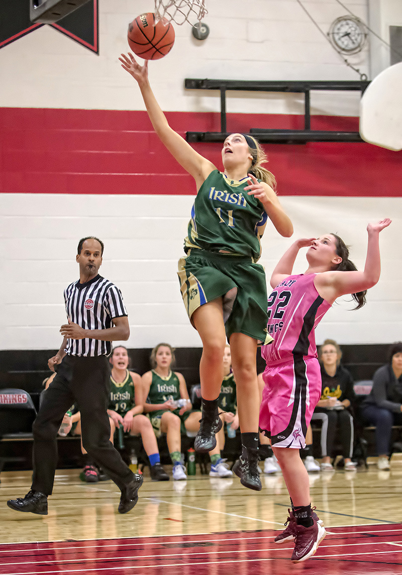 Breanne Pretty of St. Patrick’s and Meghan Jackson of Northern Collegiate, right, battle for possession during an intense senior girls’ high school basketball game played Oct. 12.
