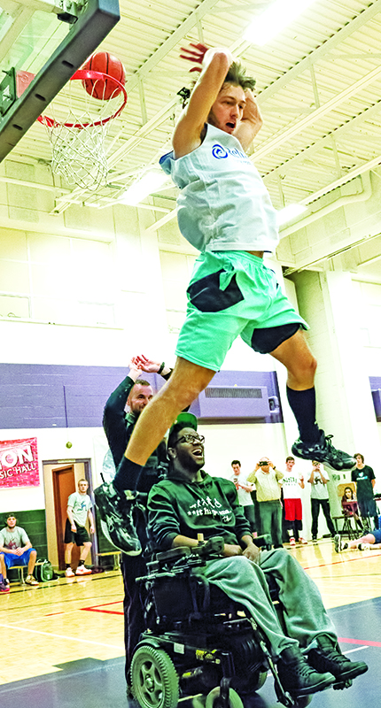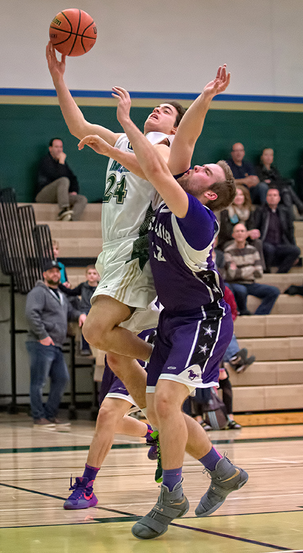 Bennett Vani, #24, of the St. Patrick’s senior boys basketball team, collides with Devin Cardinal of Great Lakes during a LKSSAA league game played Feb 7. Host St. Pat’s defeated…