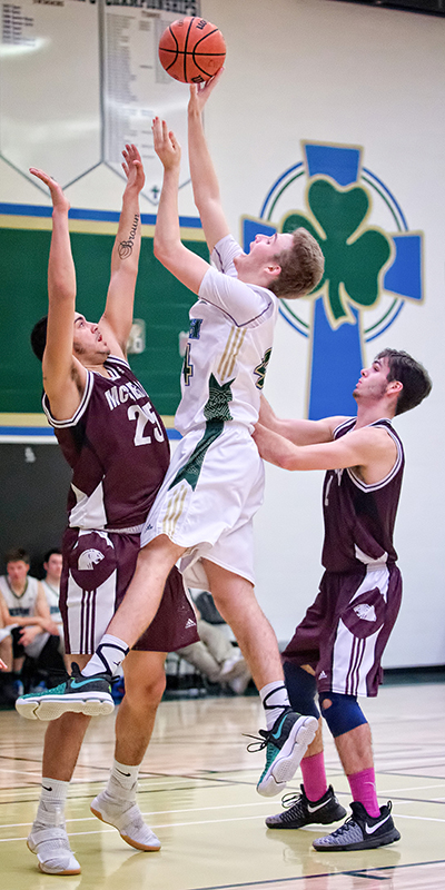 Grant Dugas of the St Patrick’s Fighting Irish goes up for a shot against two defenders from visiting John McGregor secondary of Chatham during an LKSSAA senior boys basketball game…