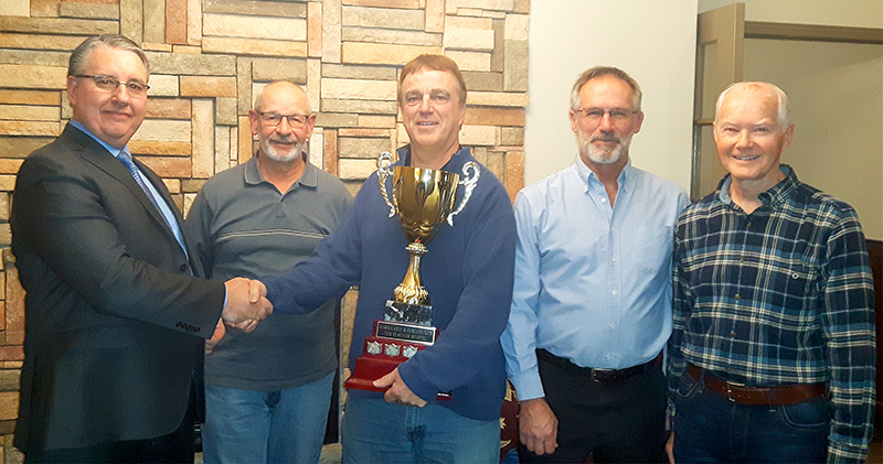 Skip Ole Kihle, centre, holds the trophy after his foursome was the overall winner of the Sarnia Golf and Curling Club’s Tier 55 Senior Bonspiel on Jan. 4.