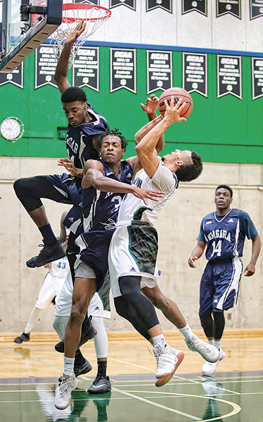 Niagara Knight's teammates Jordan McDonald and Kevin Cooper attempt to stop Brandon Padgett of Lambton College as he drives to the basket in an OCAA league home game on Nov.…