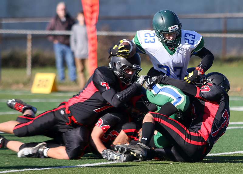 Ball carrier Aiden Wildfong, #23, of St. Patrick’s struggles to fight off a pair of Northern Collegiate defenders in a junior football semi-final played Nov. 12 at Norm Perry Park.