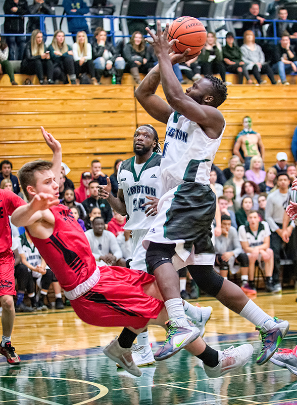 Lambton College’s Ousmane Kromah attempts a shot while making contact with Jake Price of the Fanshawe Falcons during Lambton’s first men’s basketball home game of the OCAA season on Nov.…