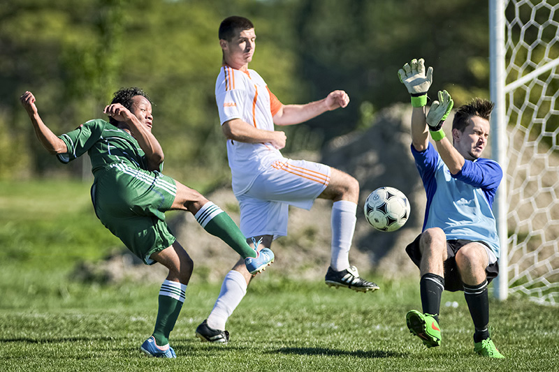 Tristan-Paul Aguiar of the Lambton Lions men's soccer team, in green, attempts a close-range shot against the Mohawk College keeper, who made the save in an OCAA soccer game played…