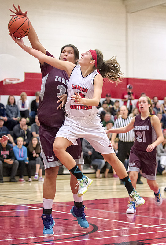 Abby Whiteye of Northern Collegiate, in white, is denied on a two-point attempt by a Wallaceburg District defender in senior girls’ high school basketball action on Thursday, Sept. 29.