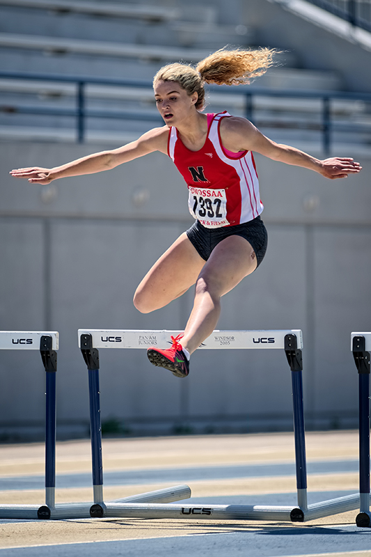 Kristy Hodgins of Northern Collegiate clips the second-last hurdle in the senior girls 400-metre hurdles at the SWOSSA track and field finals in Windsor, Ont.