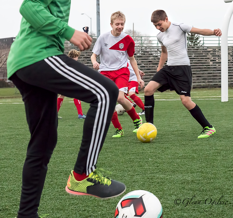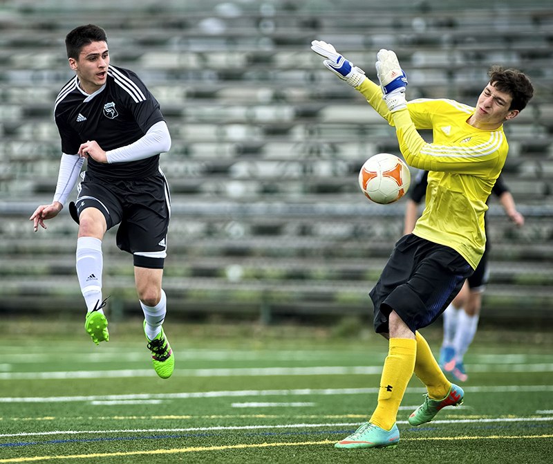 Goalkeeper Stefan Mallozzi of St. Patrick’s High School makes a close-in stop against Northern Collegiate’s Sam Fairbairn in LKSSAA soccer action April 21 at Norm Perry Park. The big save…