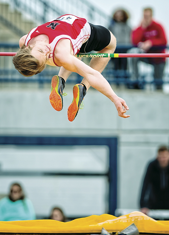 Northern Collegiate’s Sebastian Smith clears 2.03 metres in the Senior Boys’ High Jump at the 11th annual Lancers Prep Invitational held in Windsor recently, where he finished in first place.…
