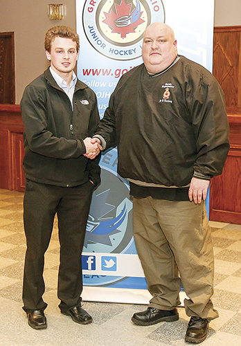 Brandon Layman of the Sarnia Legionnaires was a runner-up for the Western Ontario Hockey Conference's Most Valuable Player Award for 2016. Layman, shown here being congratulted by team assistant general…