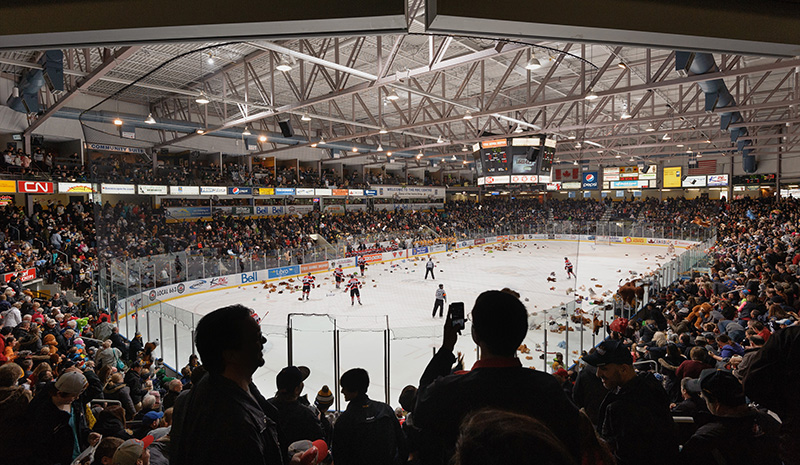 Sting fans celebrate Sarnia's first goal of Sunday's home game by throwing a record 3,580 stuffed animals to the ice in the annual Lambton Ford Teddy Bear Toss game at…