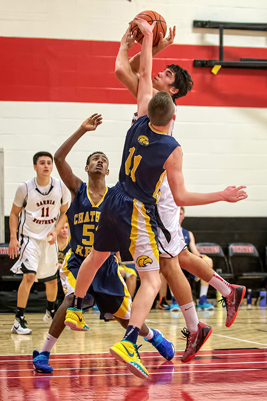 Greg Bressette of Northern Collegiate drives to the basket while getting fouled by a Chatham-Kent Hawk during the opening game of the senior boys high school basketball season in Sarnia…