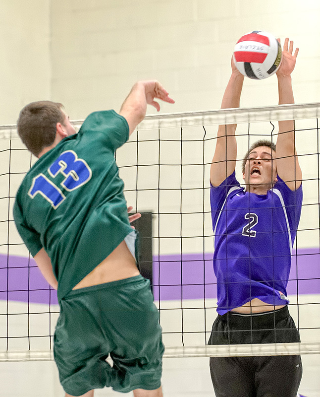 Eagle Bressette of the St. Clair Colts senior boys basketball team, right, sets up a block against Jaxon Gordon of St. Patrick’s during the St Clair Junior and Senior Boys…