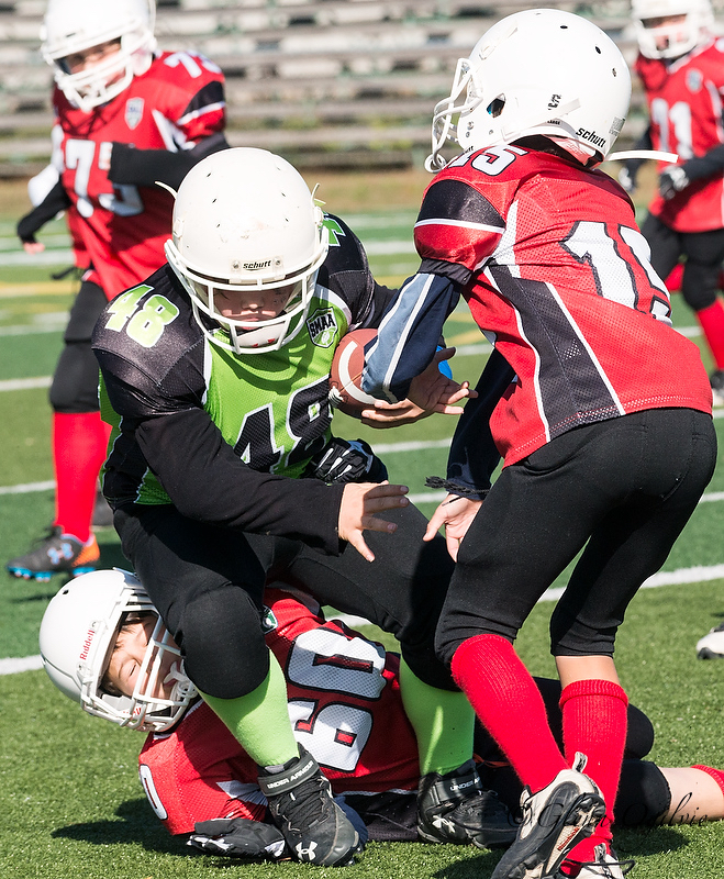 Ball carrier Josh Hillsdon of the Brownstones Skyfire is taken down by two defenders from the Vidal Pharmacy Raiders, Adam Fonja (#60) and Josh Graham (#15) in SMAA peewee football…