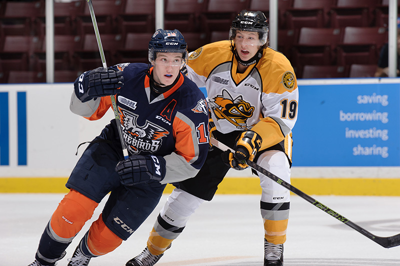 Centre Ryan McGregor of the Sarnia Sting checks a player from the visiting Flint Firebirds in OHL action at the Sarnia Sports and Entertainment Centre Friday.
