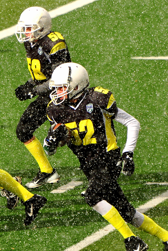 Dodging wet snowflakes to reach the goal line, Austin West (#52) of the Bigras Painting Tiger Sharks gets protection from teammate Liam Ellis (#58) in SMAA football action on Oct.…