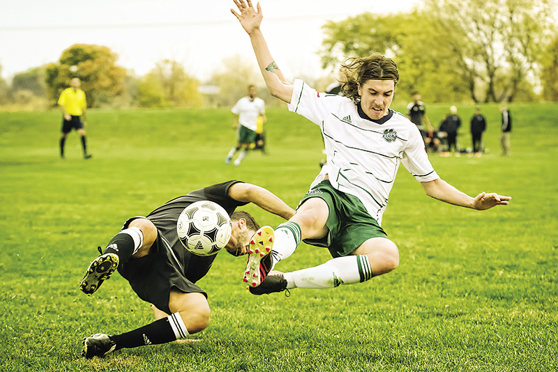 Lambton Lions striker Elliot Pecora, of Sarnia, collides with an opponent during the final match of soccer season on Oct. 21, which ended in a 1-1 tie. The Lions ended…