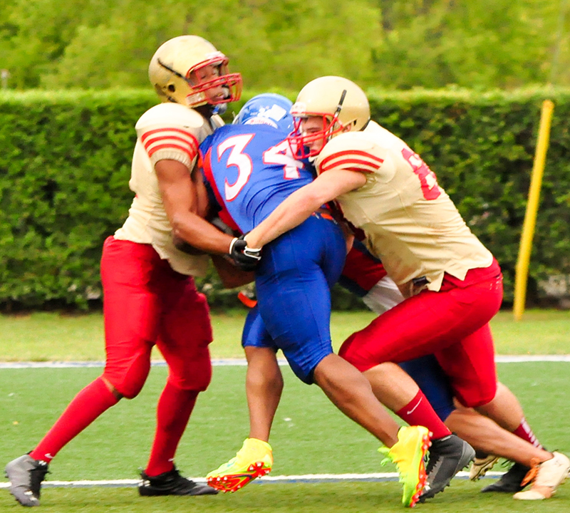 Sarnia Imperial teammates Ray McDonald (#21) and Jeremy Jones (#88) double-team an Ottawa Invader ball carrier during the Northern Football Conference semi-final played Aug. 8 at Norm Perry Park.