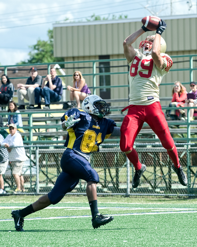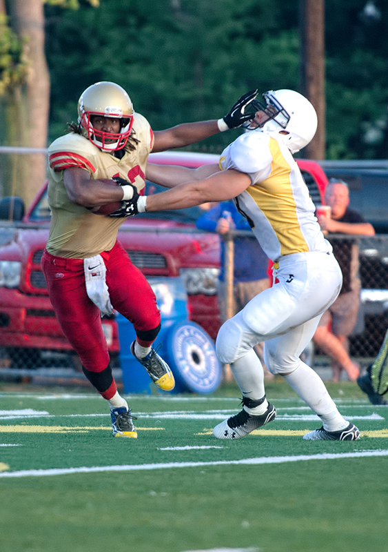 Shawn Hayes (#12) of the Sarnia Imperials holds off an opponent on the Sault Ste. Marie Steelers during a July 25 Northern Football Conference tilt at Norm Perry Park.