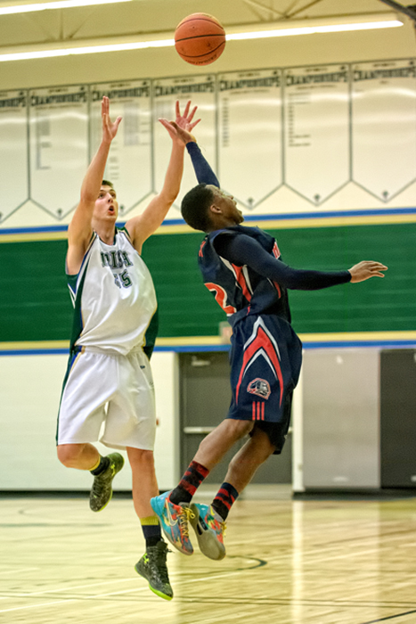 Joe Jarvis, left, of the St. Patrick’s High School senior boys basketball team, takes a high pass during the SWOSSA Qualifier game hosted by Holy Names of Windsor on March…