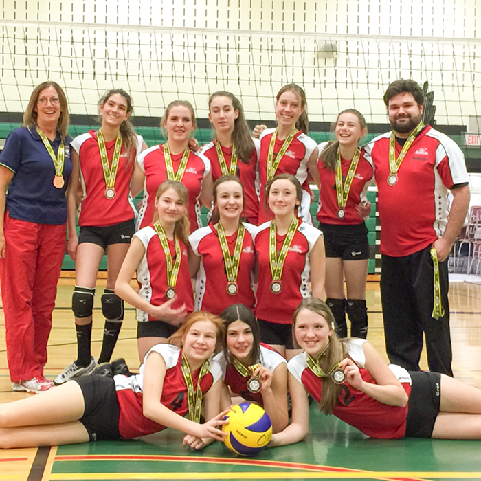 The Twin Bridges Thunder indoor volleyball team of Sarnia won a bronze medal at the 14U McGregor Cup in the OVA Trillium A Division in Windsor on Feb. 21.